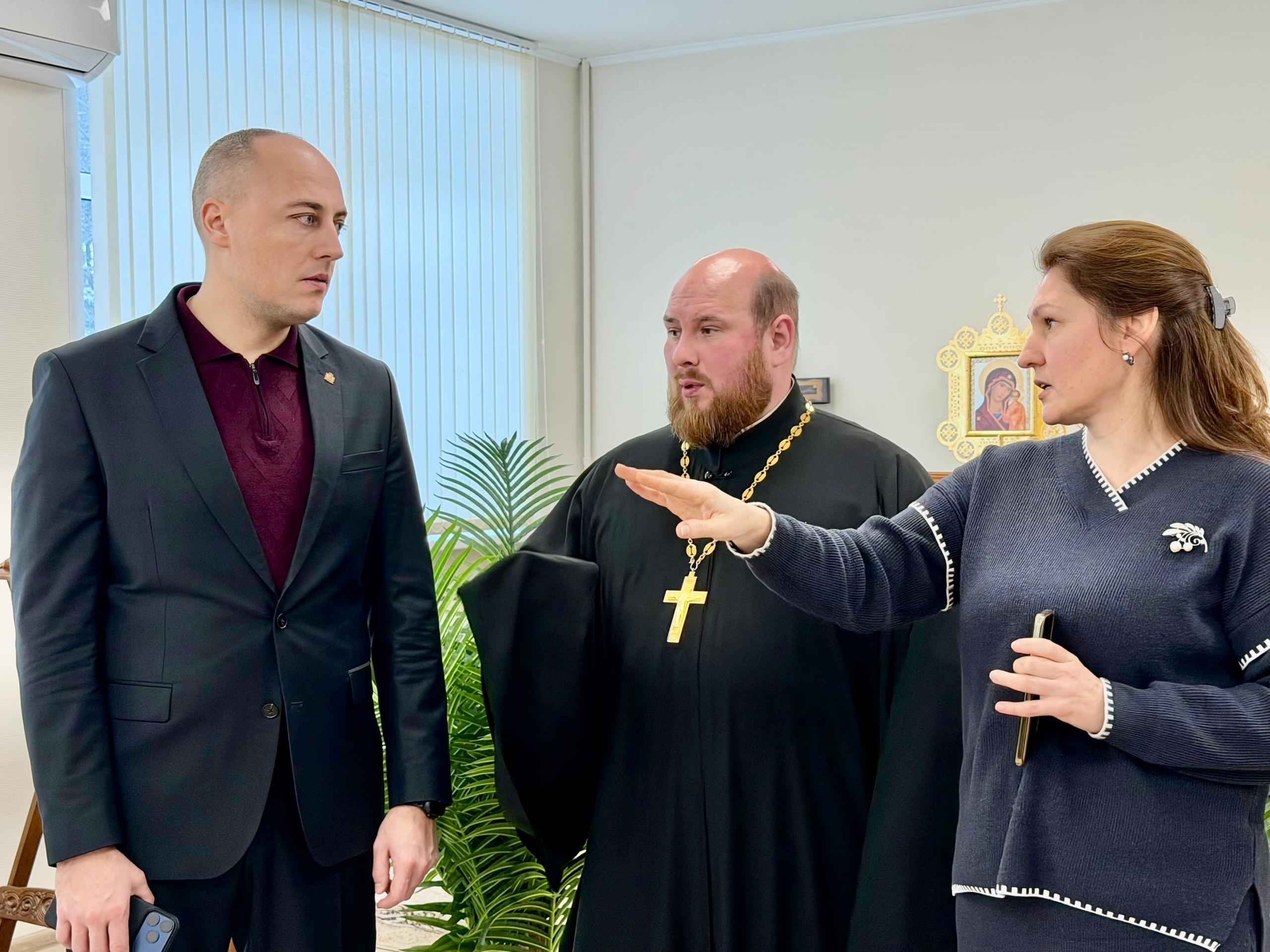 Вице-губернатор Артём Бранов и отец Дмитрий обсуждают планы по открытию храма в реабилитационном центре.